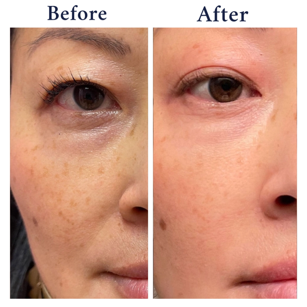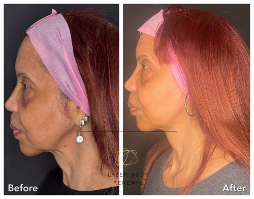 65 year old female 30 days after NeoGen on face neck and eyes. (Note: There is no makeup on her skin. This client had lipstick tattooed between pictures. High energy NeoGen at 3.5 J whole face and neck. 2 passes around eyes, and two passes around jawline with neck lift.