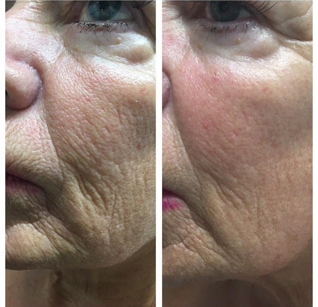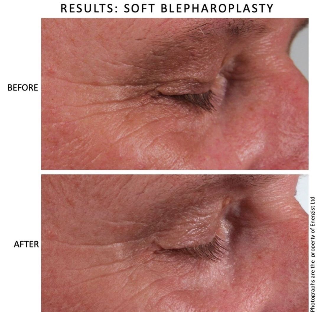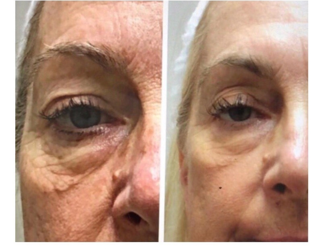 Single session, medium energy. Two passes around eye bags and upper lids. Two passes around peri oral area